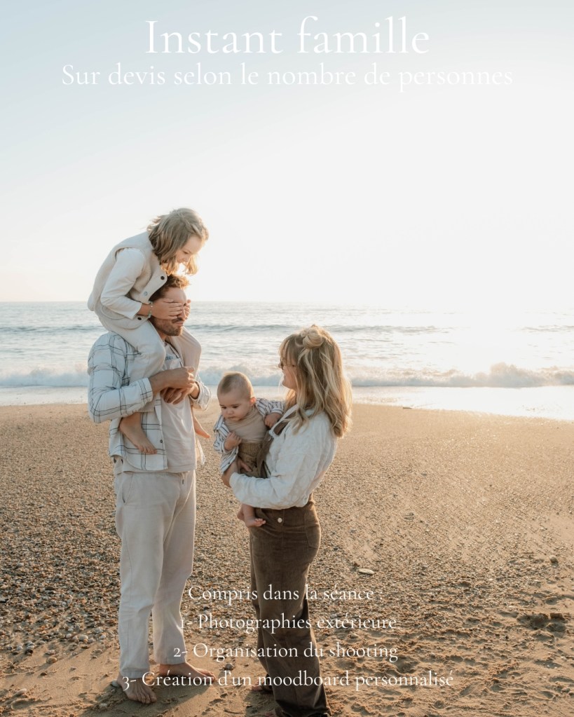 Je propose des séances adaptées à vos envies : séance photo individuel, séance photo de couple, séance photo de mariage, séance photo de famille, animaux, séance photo de grossesse ou projets plus personnels. Avec douceur et authenticité, je capture ce qu’il y a de plus beau : vous.